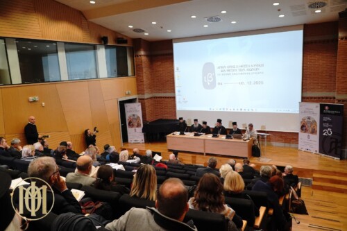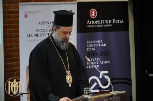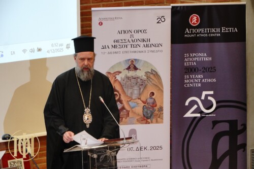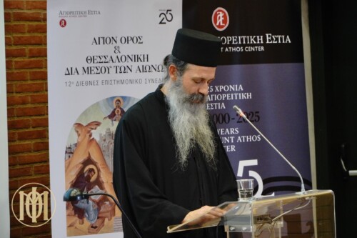 Την Πέμπτη 4 Δεκεμβρίου στο αμφιθέατρο «Στέφανος Δραγούμης» του Μουσείου Βυζαντινού Πολιτισμού πραγματοποιήθηκε η έναρξη του 12ου Διεθνούς Επιστημονικού Συνεδρίου «ΑΓΙΟΝ ΟΡΟΣ & ΘΕΣΣΑΛΟΝΙΚΗ ΔΙΑ ΜΕΣΟΥ ΤΩΝ ΑΙΩΝΩΝ», το οποίο διοργανώνεται από την Αγιορειτική Εστία. Τους προσκεκλημένους και το πολυπληθές ακροατήριο καλωσόρισε ο κ. Αναστάσιος Ντούρος, Διευθυντής της Αγιορειτικής Εστίας.