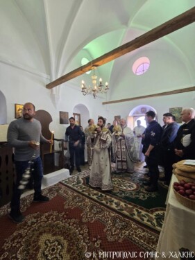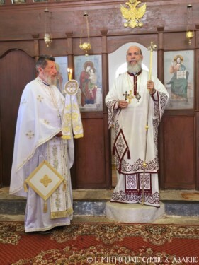 Μετά τήν τέλεση ὑπό τοῦ Σεβασμιωτάτου, τοῦ Ἁγιασμοῦ, κατά τό ἔθος, τῆς Δευτέρας τοῦ Πάσχα, μέ τόν ὁποῖον ἀγιάστηκε ὁ ἀνακαινισθείς Ἱερός Ναός καί ὅλοι οἱ βοηθητικοί Χῶροι, ἐτελέσθη ἡ Ἀρχιερατική Θ. Λειτουργία, πραγματοποιήθηκε ἡ λιτάνευσις τῆς παλαιφάτου Ἱερᾶς Εἰκόνος τοῦ Ἁγίου, ἀκολούθησε ἡ Ἀρτοκλασία καί ἀνεπέμφθη εἰδική Ἐπιμνημόσυνη Δέησις ὑπέρ ἀναπαύσεως τῶν ψυχῶν τῶν ἐκεῖσε διαβιωσάντων καί ἐν Κυρίῳ κοιμηθέντων Πατέρων καί ἀδελφῶν.