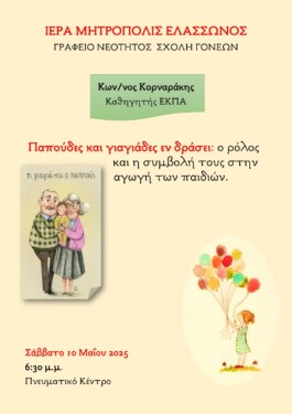 Μητρόπολη Ελασσώνος: Ομιλία το Σάββατο για τον ρόλο και την συμβολή των παππούδων και των γιαγιάδων στην αγωγή των παιδιών
