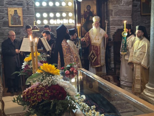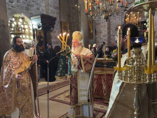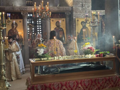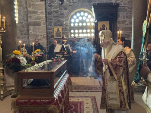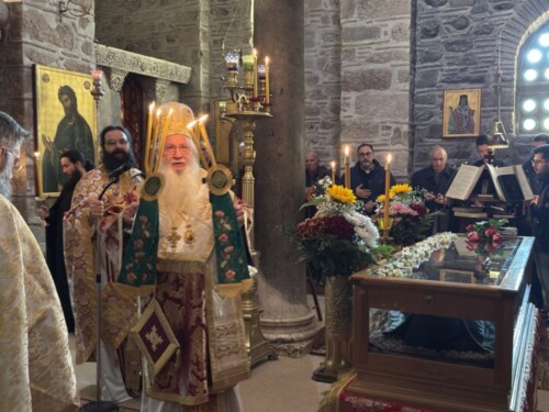 Στο τέλος της Θείας Λειτουργίας ο Σεβασμιώτατος μίλησε στους πιστούς αναφερόμενος στη ζωή του Οσίου και την ίδρυση της περιώνυμης Ιεράς Μονής του. Ιδιαιτέρως δε ο Σεβασμιώτατος αναφέρθηκε στο ιστορικό της επανόδου των ιερών λειψάνων του Οσίου στην Ιερά Μονή του, το Σάββατο των Προπατόρων 13 Δεκεμβρίου 1986, μετά από απουσία 526 χρόνων, και την επανατοποθέτησή τους στη μαρμάρινη λάρνακα του Καθολικού, όπου ήταν τοποθετημένα μέχρι το 1460 μ.Χ., όταν οι μοναχοί, λόγω της Τουρκοκρατίας, αναγκάσθηκαν να απομακρύνουν τα ιερά λείψανα από την Ιερά Μονή.