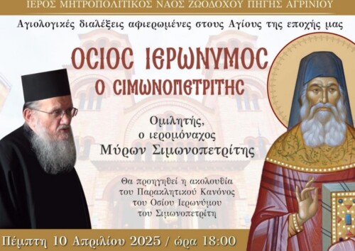 Την Πέμπτη 10 Απριλίου 2025 και ώρα 6:00 το απόγευμα, στον Ιερό Μητροπολιτικό Ναό Ζωοδόχου Πηγής Αγρινίου θα πραγματοποιηθεί η έβδομη αγιολογική σύναξη, η οποία θα είναι αφιερωμένη στον Όσιο Ιερώνυμο τον Σιμωνοπετρίτη.