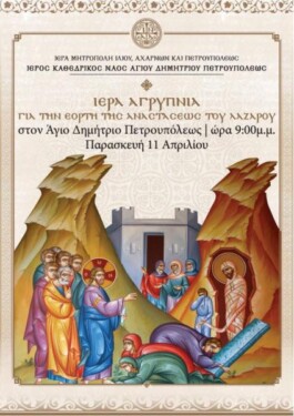 Ιερά αγρυπνία για την εορτή της Αναστάσεως του Λαζάρου θα τελεστεί την Παρασκευή 11 Απριλίου 2025 στις 21:00, στον Ι.Ν. Αγίου Δημητρίου Πετρουπόλεως.
