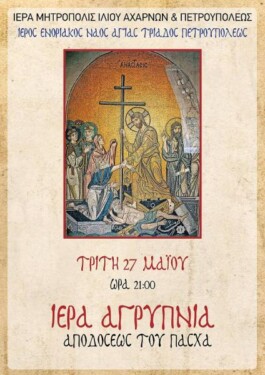 Στον Ιερό Ναό Αγίας Τριάδας Πετρουπόλεως θα τελεστεί Ιερά Αγρυπνία επί τη Αποδόσει του Πάσχα, την Τρίτη 27 Μαΐου 2025, στις 21:00