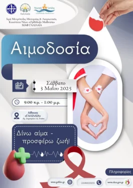 Η Μονάδα Ανακουφιστικής Φροντίδας «ΓΑΛΙΛΑΙΑ» και η Κοινότητα Νέων της Ιεράς Μητροπόλεως Μεσογαίας και Λαυρεωτικής «Ορθόδοξη Μαθητεία» σας προσκαλούν στην Αιμοδοσία που διοργανώνουν το Σάββατο, 3 Μαίου 2025 και ώρες 9.00-13.00 στην Αίθουσα της «ΓΑΛΙΛΑΙΑΣ» (Αγ. Δημητρίου 23, Σπάτα – βλ. χάρτη).