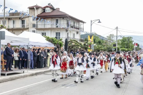 Στη συνέχεια, οι παριστάμενοι παρακολούθησαν την καθιερωμένη παρέλαση τμημάτων μαθητών και συλλόγων με παραδοσιακές φορεσιές σχεδόν απ’ όλη την Ελλάδα.
