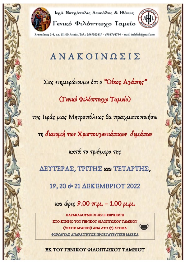Ανακοίνωση Γενικού Φιλοπτώχου Ταμείου Ιεράς Μητροπόλεως Λευκάδος περί διανομής Χριστουγεννιάτικων δεμάτων
