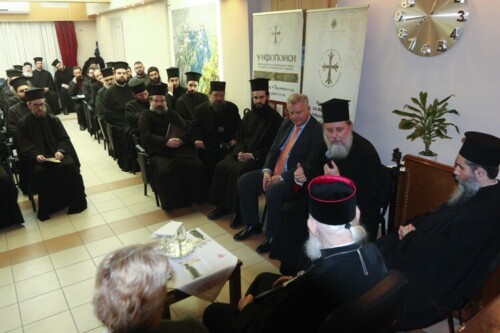 Χαιρετισμό απηύθυναν οι κ. Ιωάννης Παναγιωτόπουλος, Πρόεδρος του Τμήματος Θεολογίας του Ε.Κ.Π.Α, ο κ. Αθανάσιος Γλάρος, Καθηγητής του Τμήματος Ποιμαντικής Θεολογίας του ίδιου Πανεπιστημίου, ο κ. Αθανάσιος Καψάλης, Διευθυντής της Ανώτατης Εκκλησιαστικής Ακαδημίας, καθώς και ο κ. Νικόλαος Γιαννής, Διευθυντής της Ριζαρείου Εκκλησιαστικής Σχολής, οι οποίοι αναφέρθηκαν στη σημασία της θεολογικής επιστήμης για τη συγκρότηση των μελλοντικών κληρικών.