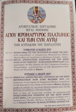 ΩΡΑ 07.00 Ὄρθρος καί Ἀρχιερατική Θεία Λειτουργία στόν Ἱερό Μητροπολιτικό Ναν Ἁγίων Βικτώρων Χίου, ὅπου ἐναπετέθησαν και φυλάσσονται τά ἱερά λείψανα τοῦ Ἱερομάρτυρος Πλάτωνος, ἱερουργοῦντος τοῦ Σεβ. Μητροπολίτου Χίου, Ψαρῶν καί Οἰνουσσῶν κ. Μάρκου. Θά ψάλει ἡ χορωδία τῶν μαθητῶν τοῦ «Διονυσιείου Μουσικοῦ Σχολείου Χίου» ὑπό τήν διεύθυνση τοῦ καθηγητοῦ κ. Ἀθανασίου Ξενούδη.