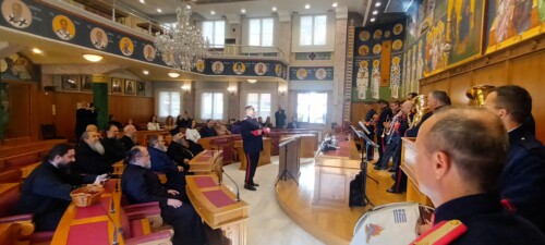 Σήμερα, Παρασκευή 19 Δεκεμβρίου, παρόντος του Θεοφιλεστάτου Αρχιγραμματέως της Ιεράς Συνόδου, έψαλε τα κάλαντα η Μουσική Μπάντα του Πυροσβεστικού Σώματος, υπό την διεύθυνση του Αρχιμουσικού–Υποπυραγού κ. Δημήτριου Κουνδουράκη.