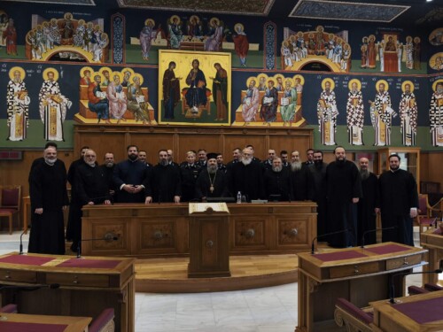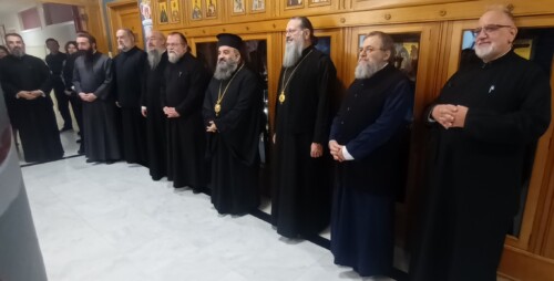 Ο Θεοφιλέστατος Αρχιγραμματεύς κ. Ιωάννης καλωσόρισε όλους τους επισκέπτες στην Ιερά Σύνοδο και τους μετέφερε τις εόρτιες ευχές του Μακαριωτάτου Αρχιεπισκόπου Αθηνών και πάσης Ελλάδος κ. Ιερωνύμου.