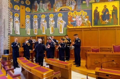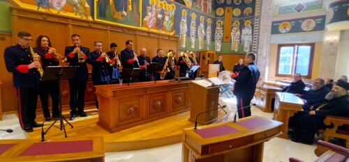 Σήμερα, Παρασκευή 19 Δεκεμβρίου, παρόντος του Θεοφιλεστάτου Αρχιγραμματέως της Ιεράς Συνόδου, έψαλε τα κάλαντα η Μουσική Μπάντα του Πυροσβεστικού Σώματος, υπό την διεύθυνση του Αρχιμουσικού–Υποπυραγού κ. Δημήτριου Κουνδουράκη.