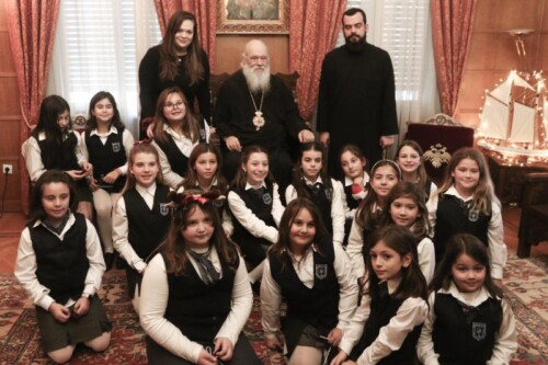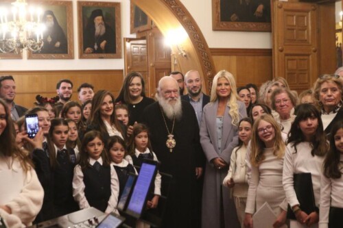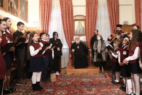 Στη συνέχεια, παραδοσιακά χριστουγεννιάτικα τραγούδια έψαλαν στον Μακαριώτατο παιδιά από τη Δομή Φιλοξενίας Προσφύγων – Μεταναστών «ΣΥΝΥΠΑΡΞΙΣ». Τα παιδιά, συνοδευόμενα από τον Πρόεδρο της Διοικούσας Επιτροπής, Μητροπολίτη Ιλίου, Αχαρνών και Πετρουπόλεως κ. Αθηναγόρα, και τον Γενικό Διευθυντή, Αρχιμανδρίτη π. Παντελεήμονα Παπασυνεφάκη, συνομίλησαν με τον Αρχιεπίσκοπο και του ευχήθηκαν καλά Χριστούγεννα. Από την πλευρά του, ο Μακαριώτατος ενδιαφέρθηκε να μάθει από πού κατάγονται τα παιδιά, για τις ανάγκες και τα προβλήματά τους, και τους ευχήθηκε με τη σειρά του καλά Χριστούγεννα, με υγεία και δύναμη, ενώ συνεχάρη τον Μητροπολίτη Ιλίου και τον π. Παντελεήμονα για το σημαντικό έργο της ΑΜΚΕ.