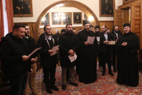 Αμέσως μετά, τα κάλαντα έψαλαν σπουδαστές από τη Σχολή Μαθητείας Υποψηφίων Κληρικών (Σ.Μ.Υ.Κ.). Τους σπουδαστές συνόδευαν ο Καθηγητής Μητροπολίτης Περιστερίου κ. Γρηγόριος, ο Επίσκοπος Ταλαντίου κ. Θεολόγος, Γενικός Διευθυντής του Ι.Π.Ε. της Ι.Α.Α., ο οποίος μετέφερε στον Αρχιεπίσκοπο ευχές εκ μέρους του ΕΣΕΕ, καθώς και ο Διευθυντής της ΣΜΥΚ – Ριζαρείου, Αρχιμανδρίτης Πολύκαρπος Κάστιζας, μαζί με καθηγητές της Σχολής.