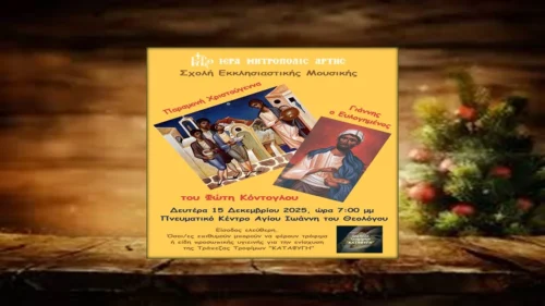 H Σχολή Εκκλησιαστικής Μουσικής της Ιεράς Μητροπόλεως Άρτης, σας προσκαλεί τη Δευτέρα 15 Δεκεμβρίου 2025 στις 7 το απόγευμα, στην Χριστουγεννιάτικη εκδήλωση με τίτλο «Παραμονή Χριστούγεννα – Γιάννης ο Ευλογημένος» του Φώτη Κόντογλου, που θα πραγματοποιηθεί στο Πνευματικό Κέντρο του Αγίου Ιωάννου του Θεολόγου. Θα ακουστούν τα ομώνυμα Χριστουγεννιάτικα διηγήματα, διανθισμένα με κάλαντα και θρησκευτικούς ύμνους.