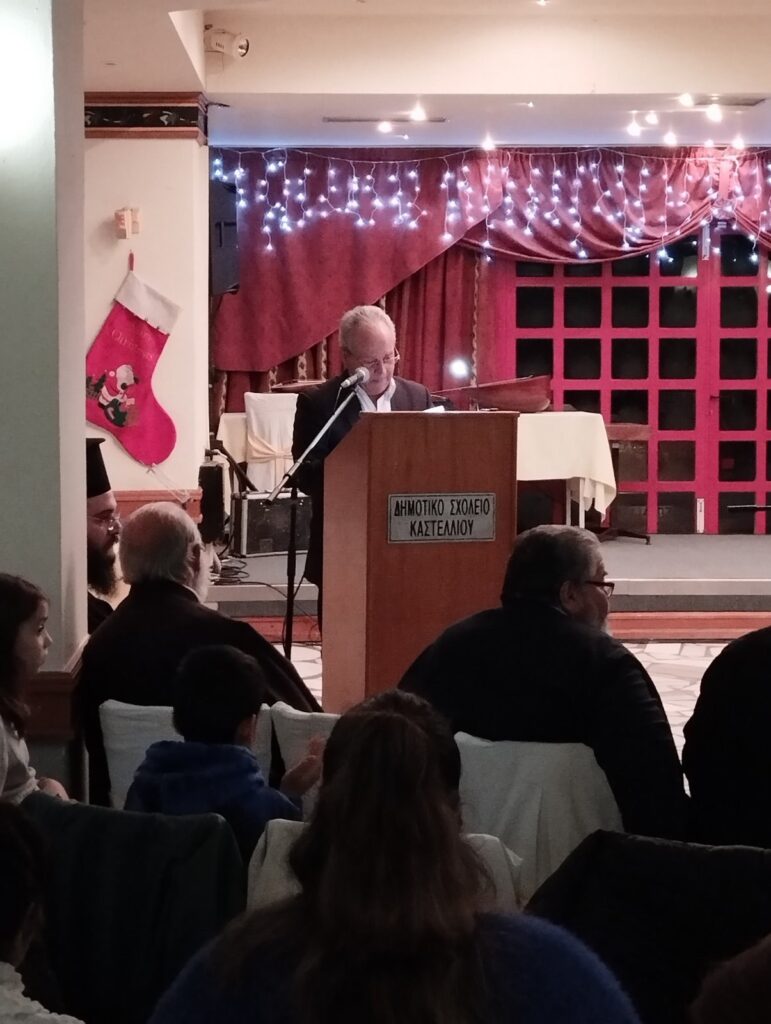 Κεντρικός ομιλητής ήταν ο Προϊστάμενος της Ενορίας Αρχιμ. Ιερόθεος Χιώτης, ο οποίος αναφέρθηκε στο κοσμοσωτήριο γεγονός της ενανθρωπίσεως του Υιού Λόγου, του Δευτέρου Προσώπου της Αγίας Τριάδος. Στη συνέχεια, οι Δασκάλες του Δημοτικού Σχολείου Καστελλίου κα Μαρία Αργουδέλη και κα Έφη Καλυκάκη ανέγνωσαν χριστουγεννιάτικα παραμύθια. Ακολούθως, η χορωδία της Βυζαντινής Μουσικής της Ιεράς Μητροπόλεώς Αρκαλοχωρίου , υπό τη διεύθυνση του π. Νικολάου Σταματάκη, έψαλε Ύμνους από το Άγιο Δωδεκαήμερο και κάλαντα, από όλη την Ελλάδα και τις αλησμόνητες πατρίδες. Η εκδήλωση ολοκληρώθηκε από τους μαθητές της «Σχολής Εκμάθησης Παραδοσιακών Οργάνων» και του «Κατηχητικού Σχολείου» της Ενορίας Καστελλίου, οι οποίοι τραγούδησαν πρωτοχρονιάτικα τραγούδια, υπό την καθοδήγηση του Μουσικοδιδασκάλου κ. Νίκου Χναράκη και της Χοράρχου κας Σταματίας Καραγιάννη.