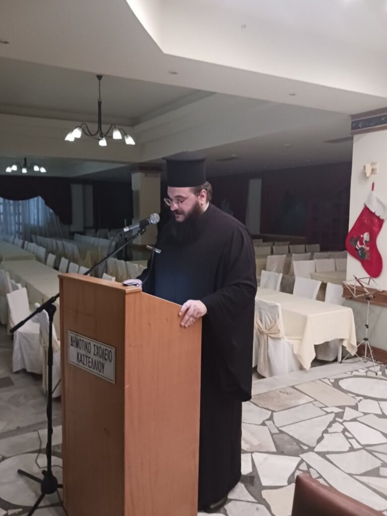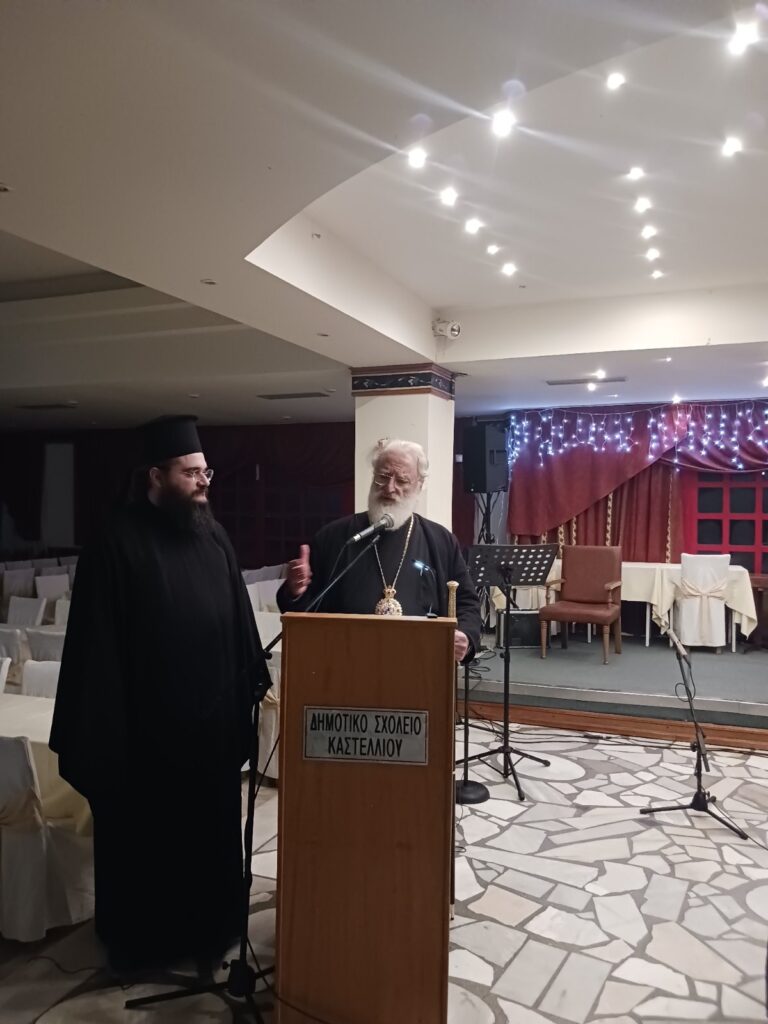 Τέλος, ο Σεβασμιώτατος Μητροπολίτης Αρκαλοχωρίου, Καστελλίου και Βιάννου κ. Ανδρέας στην προσλαλιά του συνεχάρη το Εκκλησιαστικό Συμβούλιο και τον Προϊστάμενο της Ενορίας Καστελλίου π. Ιερόθεο, καθώς και τον π. Γεώργιο για την πρωτοβουλία και την άρτια οργάνωση της εκδήλωσης, συνεχάρη τους γονείς που εμπιστεύονται τα παιδιά τους στην Εκκλησία, τις Δασκάλες για την συνεργασία τους με την Ενορία, τον π. Νικόλαο και τη χορωδία της Μητροπόλεως, τον κ. Χρονάλη Μανώλη που είχε την ευθύνη της παρουσίασης και ευχήθηκε σε όλους τους παρισταμένους καλή και ευλογημένη χρονιά. Στην Εκδήλωση, μεταξύ άλλων, παρέστησαν∙ ο Ηγούμενος της Ιεράς Μονής Τιμίου Προδρόμου Καλλέργη Αρχιμ. κ. Σίμων Βουτυριάδης, ο Γενικός Αρχιερατικός Επίτροπος της Ιεράς Μητροπόλεώς μας Πρωτοπρ. Γεώργιος Χριστοδουλάκης, ο Αναπλ. Γενικός Αρχιερατικός Επίτροπος Πρωτοπρ. Σπυρίδων Φουκαράκης, ο Αρχιερατικός Επίτροπος της Β’ Αρχιερατικής Περιφέρειας Πρωτοπρ. Εμμανουήλ Παπακανδεράκης, ο Εφημέριος Καστελλίου Πρωτοπρ. Γεώργιος Μαραυγάκης, ο Δήμαρχος Μινώα Πεδιάδος κ. Βασίλης Κεγκέρογλου, η Πρόεδρος της Τοπικής Κοινότητας Καστελλίου κα Μαρία Σκουλούδη, ο Διευθυντής του Δημοτικού Σχολείου Καστελλίου κ. Γεώργιος Καλογεράκης, η Πρόεδρος του Συλλόγου Γονέων και Κηδεμόνων του Δημοτικού Σχολείου Καστελλίου κα Σοφία Τσαγκάρη, καθώς και πλήθος κόσμου γονέων και παιδιών που την παρακολούθησαν.