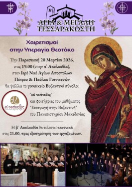 Την Παρασκευή 20 Μαρτίου, στις 7.00 μ.μ. και στις 9.00 μ.μ., θα τελεσθεί η Δ΄ Στάσις των Χαιρετισμών της Υπεραγίας Θεοτόκου στον ιερό ενοριακό ναό Αγίων Αποστόλων Πέτρου και Παύλου Γιαννιτσών.