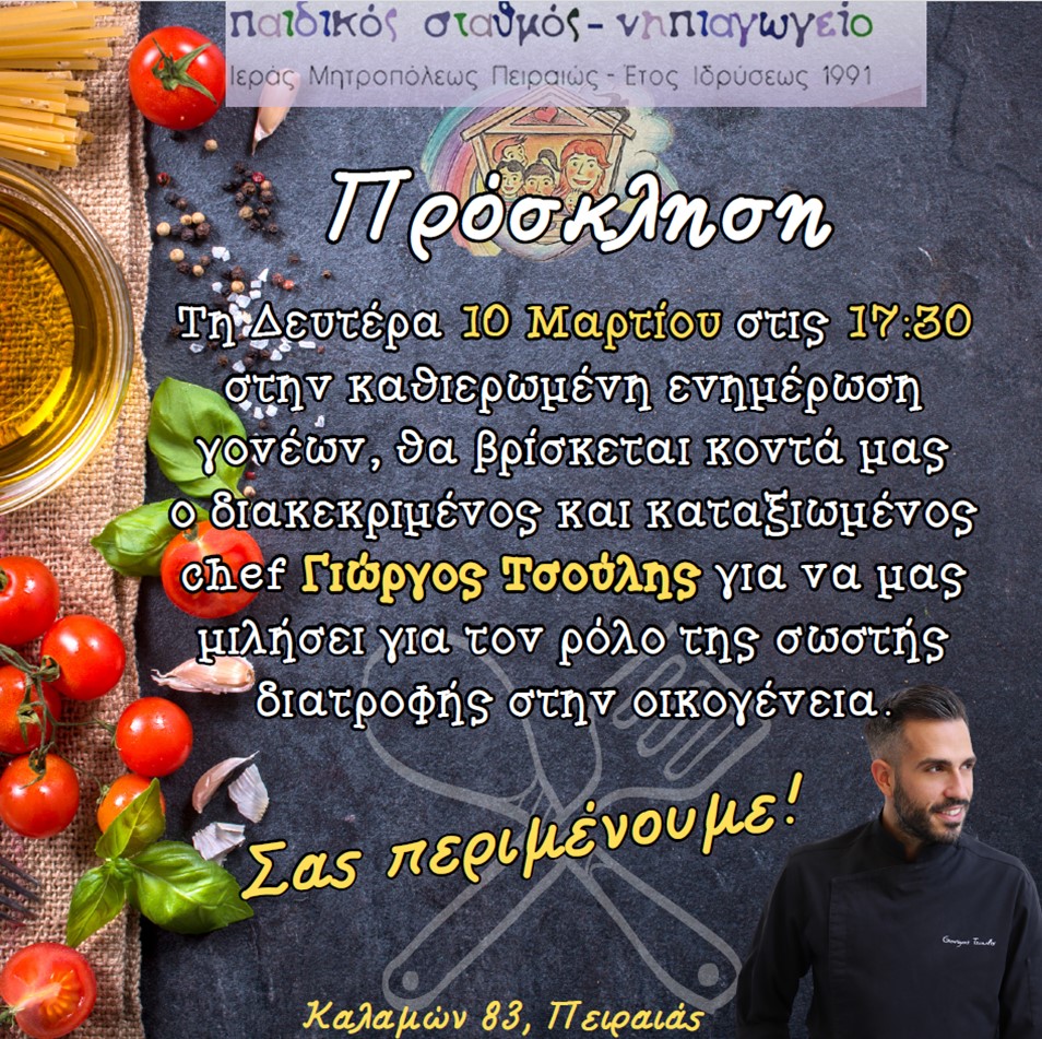 Αυτή τη Δευτέρα 10 Μαρτίου 2025 στις 17:30 ο καταξιωμένος και δημοφιλής chef  Γιώργος Τσούλης, θα βρεθεί στα Εκπαιδευτήριά μας (Καλαμών 83, Πειραιάς) προκειμένου να μιλήσει για τον ρόλο της σωστής διατροφής στην οικογένεια.