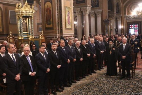 Παρέστησαν ο Πρόεδρος της Ελληνικής Δημοκρατίας κ. Κωνσταντίνος Τασούλας, ο Πρωθυπουργός κ. Κυριάκος Μητσοτάκης, ο Μητροπολίτης Λαοδικείας κ. Θεοδώρητος, Διευθυντής Εκπροσωπήσεως του Γραφείου του Οικουμενικού Πατριαρχείου στην Αθήνα, ο Μητροπολίτης Γουινέας κ. Γεώργιος, Εκπρόσωπος του Πατριάρχη Αλεξανδρείας στην Αθήνα, ο Αρχιμανδρίτης Ιερώνυμος Δελίογλου, Έξαρχος του Παναγίου Τάφου στην Αθήνα, εκπρόσωποι άλλων δογμάτων και Εκκλησιών, βουλευτές, ο Περιφερειάρχης Αττικής και ο Δήμαρχος Αθηναίων, εκπρόσωποι των Σωμάτων Ασφαλείας, των Ενόπλων Δυνάμεων, του Ελληνικού Ερυθρού Σταυρού.