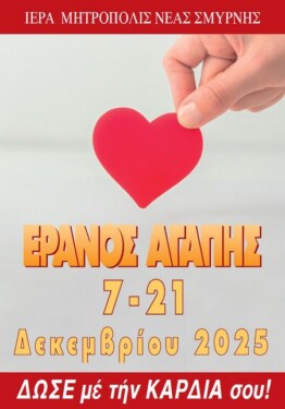 Ἐνόψει τοῦ Ἐράνου Ἀγάπης πού θά διεξαχθεῖ στή Μητρόπολή Νέας Σμύρνης ἀπό τίς 7 μέχρι καί τίς 21 Δεκεμβρίου, ὁ Σεβασμ. Μητροπολίτης κ. Συμεών ἀπευθυνόμενος πρός τόν Ἱερό Κλῆρο καί τούς εὐσεβεῖς Χριστιανούς ἀπέστειλε στίς Ἐνορίες τήν ἀκόλουθη Ἐγκύκλιο :