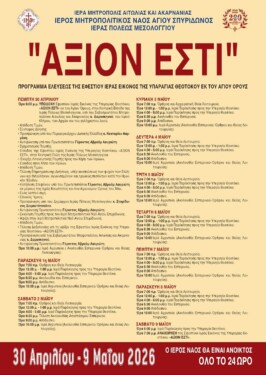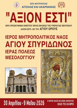 Με αισθήματα βαθείας συγκινήσεως και πνευματικής αγαλλιάσεως η Ιερά Μητρόπολις Αιτωλίας και Ακαρνανίας αναγγέλλει προς τον ευσεβή λαό την έλευση της Ιεράς και Θαυματουργού Εικόνος της Υπεραγίας Θεοτόκου «Άξιον Εστί» εκ του πανσέπτου Ιερού Ναού του Πρωτάτου του Αγίου Όρους, στην Ιερά Πόλη του Μεσολογγίου.