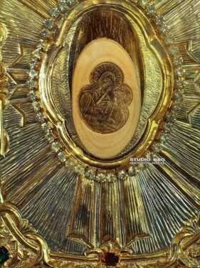 Ένα μικρό ξύλο, ένα απλό εικονίδιο, που όμως κρύβει μέσα του προσευχές, δάκρυα και αναστεναγμούς ενός ανθρώπου που έγινε φίλος του Θεού. Κάθε χάραγμα, κάθε λεπτομέρεια, φέρει τη σιωπηλή ευχή του Αγίου και την τρυφερή παρουσία της Παναγίας.