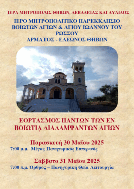 Η Ιερά Μητρόπολις Θηβών & Λεβαδείας έχει αποφασίσει να εορτάζεται η Σύναξη πάντων των εν Βοιωτία Αγίων στον Ιερό Ναό τους μεταξύ Άρματος και Ελεώνα Θηβών (πλησίον Σωφρονιστικών Καταστημάτων Ελεώνος) κάθε τελευταίο Σάββατο του Μαΐου εκάστου έτους. Το εσπέρας της Παρασκευής τελείται  Μέγας Πανηγυρικός Εσπερινός και την κυριώνυμο ημέρα Όρθρος & Θεία Λειτουργία. Η μνήμη των Αγίων πραγματοποιείται ως Πανενοριακή Σύναξη όλων των Ορθοδόξων Χριστιανών της Βοιωτικής Γης. Πλήθος κόσμου από όλη την Βοιωτία και όχι μόνο κατακλύζει τον Ιερό Ναό για να προσκυνήσει τα χαριτόβρυτα Άγια Λείψανα, τα οποία μεταφέρονται εκεί τις ημέρες αυτές. Όλων των Ακολουθιών προΐσταται ο Σεβασμιώτατος Μητροπολίτης κ. Γεώργιος πλαισιωμένος από τους Κληρικούς & Μοναστικές Αδελφότητες της Βοιωτικής Εκκλησίας.