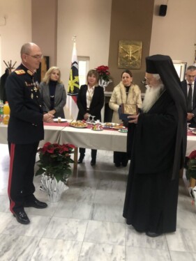 Την Πέμπτη 4 Δεκεμβρίου ο Σεβασμιώτατος μετέβη στο Κέντρο Εκπαιδεύσεως Πυροβολικού Θηβών, όπου τέλεσε Δοξολογία για την Προστάτιδα του Πυροβολικού Αγία Βαρβάρα, με την παρουσία των στρατιωτικών και πολιτικών αρχών της περιοχής. Ο Σεβασμιώτατος αναφέρθηκε στην Αγία Βαρβάρα, καθώς και στη μεγάλη εορτή των Χριστουγέννων τονίζοντας το αληθινό νόημα της εορτής, το οποίο έχει παρερμηνευτεί στις ημέρες μας, και εξέφρασε τις θερμές ευχές του στους αξιωματικούς και τους οπλίτες του Κέντρου Εκπαιδεύσεως. Επίσης, ο Διοικητής του Κέντρου Εκπαίδευσης, Ταξίαρχος κ. Ηλίας Μηδιούρης πρόσφερε στον Σεβασμιώτατο μια εικόνα της Αγίας Βαρβάρας, ως ένδειξη ευχαριστίας για τη συνεχή ποιμαντική του μέριμνα για το Κέντρο Εκπαιδεύσεως.