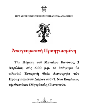 Την Πέμπτη του Μεγάλου Κανόνος (3 Απριλίου) το απόγευμα, ώρα 6.00μ.μ., θα τελεσθεί Εσπερινή Θεία Λειτουργία των Προηγιασμένων Δώρων στον ιερό ενοριακό ναό Κοιμήσεως της Θεοτόκου (Μητρόπολη) Γιαννιτσών.