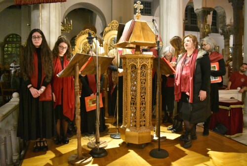 Κατά τον Όρθρο και τη Θ. Λειτουργία έψαλαν: α) η Χορωδία των σπουδαστών της Στρατιωτικής Σχολής Αξιωματικών Σωμάτων (Σ.Σ.Α.Σ.) και β) ο Βυζαντινός Χορός φοιτητριών «Αγία Ανυσία» της Ελληνικής Ένωσης για τη Μουσική Εκπαίδευση (Ε.Ε.Μ.Ε.), υπό τη διεύθυνση της κας Μαρίας Αλεξάνδρου, Καθηγήτριας του Τμήματος Μουσικών Σπουδών του Α.Π.Θ.