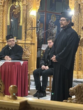 Στη συνέχεια πραγματοποιήθηκαν ολιγόλεπτες αναφορές από δύο πνευματικά τέκνα του Θεοφιλεστάτου, τον π. Ιερώνυμο και τον Τιμόθεο, οι οποίοι μίλησαν για τον τρόπο με τον οποίο γνώρισαν την Ορθόδοξη Εκκλησία και για το πνεύμα που βίωσαν μέσα από την ιεραποστολική διακονία, μεταφέροντας προσωπικές εμπειρίες και μαρτυρίες πίστεως.