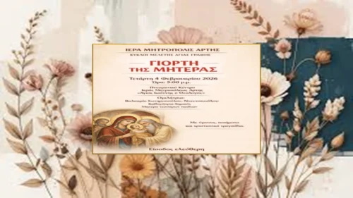 Γίνεται γνωστὸ στοὺς εὐσεβεῖς Χριστιανούς, ὅτι μὲ ἀφορμὴ τὴν Ἑορτὴ τῆς Ὑπαπαντῆς, ἡ ὁποία, γιὰ τοὺς Ὀρθοδόξους, εἶναι ἡ Γιορτὴ τῆς Μητέρας, οἱ Κύκλοι Μελέτης Ἁγίας Γραφῆς τῆς Ἱερᾶς Μητροπόλεώς ‘Αρτης  διοργανώνουν ἐκδήλωση πρὸς τιμὴν τῆς Μητέρας, τὴν Τετάρτη 4 Φεβρουαρίου 2026 καὶ ὥρα 5 τὸ ἀπόγευμα, στὸ Πνευματικὸ Κέντρο τῆς Ἱερᾶς Μητροπόλεως Ἄρτης, «Ἅγιος Ἰωάννης ὁ Θεολόγος».