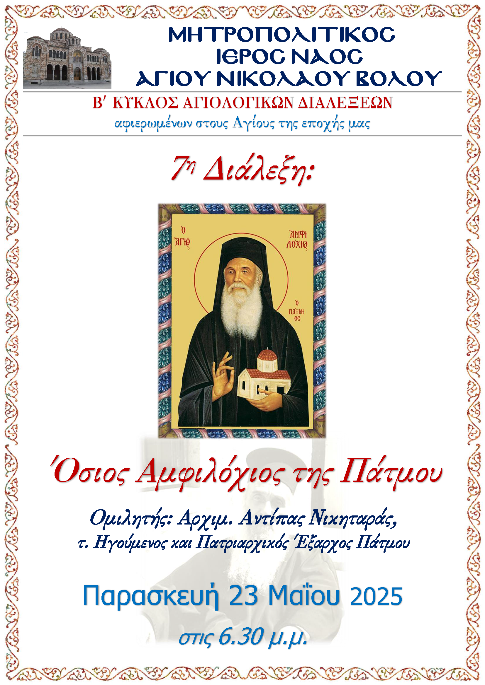 Η 7η και τελευταία, για το τρέχον Εκκλησιαστικό έτος, διάλεξη θα πραγματοποιηθεί την Παρασκευή 23 Μαΐου, στις 6.30 μ.μ. και θα είναι αφιερωμένη στον Όσιο Αμφιλόχιο της Πάτμου. Ομιλητής θα είναι ο Πανοσιολογιώτατος Αρχιμανδρίτης Αντίπας Νικηταράς τ. Ηγούμενος και Πατριαρχικός Έξαρχος Πάτμου.