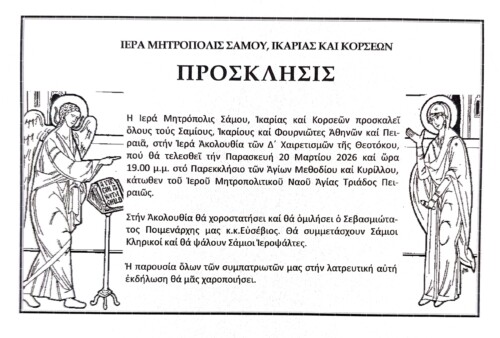 Ἡ Ἱερὰ Μητρόπολις Σάμου, Ἰκαρίας καί Κορσεῶν προσκαλεῖ ὅλους τούς Σαμίους, Ἰκαρίους καί Φουρνιώτες Ἀθηνῶν καί Πειραιᾶ, στήν Ἱερὰ Ἀκολουθία τῶν Δ΄ Χαιρετισμῶν τῆς Θεοτόκου, πού θά τελεσθεῖ τήν Παρασκευή 20 Μαρτίου 2026 καί ὥρα 19.00 μ.μ. στό Παρεκκλήσιο τῶν Ἁγίων Μεθοδίου καί Κυρίλλου, κάτωθεν τοῦ Ἱεροῦ Μητροπολιτικοῦ Ναοῦ Ἁγίας Τριάδος Πειραιῶς.