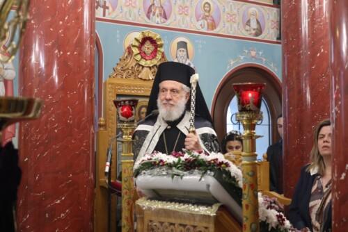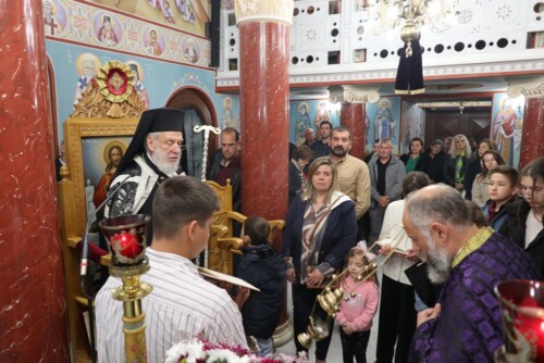 Ευχαρίστησε και συνεχάρη τον Εφημέριο του Ναού Πρωτοπρ. Ιωάννη Κουλούρη , τους Ιεροψάλτες, τους Επιτρόπους και τους Ενορίτες, για την αγάπη και τη μέριμνά τους προς τον Ναό, την παρισταμένη ευεργέτιδα του ναού κα Αικατ. Σρεκ, η οποία με τον αείμνηστο σύζυγό της Αλέξανδρο χορήγησε την εσωτερική και εξωτερική ανακαίνιση του Ναού, προς την οποία ευχήθηκε υγεία και μακροημέρευση, διένειμε στο εκκλησίασμα πασχάλιες λαμπάδες, και στα παιδιά αναμνηστικά, που φιλοτέχνησε η Ιερά Μητρόπολη, και ευχήθηκε σε όλους για το Πάσχα του Κυρίου.