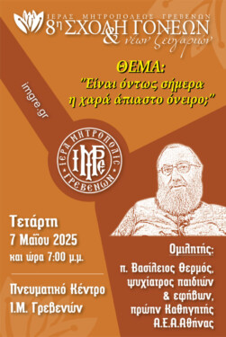 Με θέμα την χαρά κι αν αυτή είναι άπιαστο όνειρο θα κλείσει η φετινή Σχολή Γονέων & Νέων Ζευγαριών της Ι.Μ. Γρεβενών, την Τετάρτη 7 Μαΐου 2025, στις 7 μ.μ. στο Πνευματικό Κέντρο της Μητροπόλεως με καλεσμένο  τον π. Βασίλειο Θερμό, ψυχίατρος παιδιών & εφήβων και πρώην Καθηγητή Ανωτάτης Εκκλησιαστικής Ακαδημίας Αθήνας. Μία μεγάλη ευκαιρία να απολαύσουμε τον δημοφιλή, καταξιωμένο και πολυγραφότατο ιερέα και επιστήμονα μέσα στην περίοδο της Αναστάσιμης Χαράς.