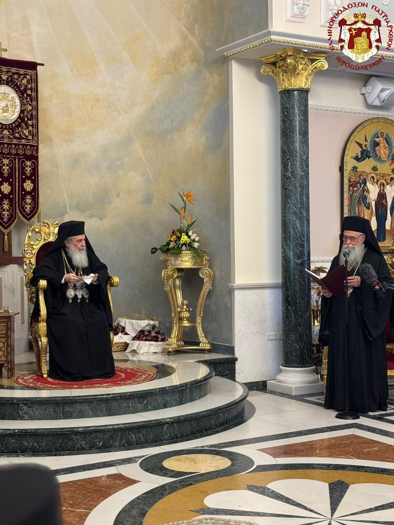 Σήμερον, ἐν τῇ ἁγίᾳ καί σεπτῇ ταύτῃ ὥρᾳ, ἡ Μήτηρ Ἐκκλησία τῶν Ἱεροσολύμων, τόν θρόνον τῆς ὁποίας «κατέσχε Ἰάκωβος ὁ τοῦ Κυρίου ἀδελφός» (Εὐσεβ. Καισαρ. Β΄ 1,2), ἀναπέμπει εὐχαριστίαν πρός τόν Κύριον, ὁ Ὁποῖος ἠξίωσεν ἡμᾶς ἰδεῖν ἀναδεικνύμενον ἐν μέσῳ ἡμῶν νέον Ἀρχιερέα τοῦ Παλαιφάτου Πατριαρχείου τῶν Ἱεροσολύμων καί Ἡγούμενον τῆς Ἱερᾶς Μονῆς τοῦ Θεοβαδίστου Ὄρους Σινᾶ, πρός διακονίαν τοῦ ἱεροῦ ἐκείνου τόπου, ὅπου ὁ Θεός ἐφανερώθη ἐν πυρί καί ἐδόθη ὁ Νόμος εἰς τόν ἄνθρωπον, ὡς γέγραπται.