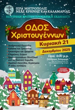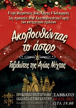 Η Χριστουγεννιάτικη Εκδήλωση των Κατηχητικών Σχολείων της Ιεράς Μητρόπολης Νέας Κρήνης και Καλαμαριάς φέτος φέρει τον τίτλο “Ακολουθώντας το άστρο: Ταξιδιώτες της Αγίας Νύχτας”. Θα πραγματοποιηθεί το Σάββατο 20 Δεκεμβρίου 7 μ.μ. στο Προκόπειο Πολυδύναμο Εκκλησιαστικό Κέντρο.