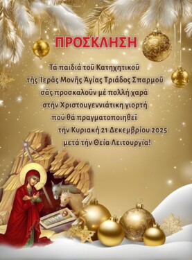 Την Κυριακή 21 Δεκεμβρίου, μετά την Θεία Λειτουργία θα πραγματοποιηθεί η Χριστουγεννιάτικη Εκδήλωση των παιδιών των Κατηχητικών της Ιεράς Μονής Αγίας Τριάδος Σπαρμού Ολύμπου.