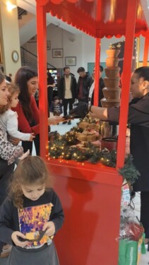 Οι παρευρισκόμενοι απόλαυσαν γιορτινά κεράσματα, ενώ τα παιδιά ενθουσιάστηκαν βουτώντας μπισκότα στο συντριβάνι σοκολάτας — μια στιγμή αυθεντικής παιδικής χαράς που σκόρπισε χαμόγελα σε μικρούς και μεγάλους. Η εκδήλωση κορυφώθηκε όταν τα μικρά παιδιά τραγούδησαν τα κάλαντα, μεταφέροντας σε όλους τη ζεστασιά και την αγνότητα της Γέννησης του Χριστού.