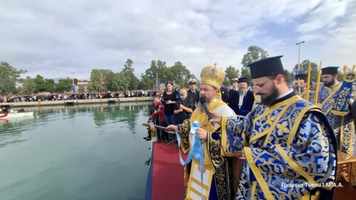 Αμέσως μετά τη Θεία Λειτουργία, ο Σεβασμιώτατος τέλεσε την Ακολουθία του Μεγάλου Αγιασμού εντός του Ναού και στη συνέχεια, με λιτανευτική πομπή, άπαντες κατευθύνθηκαν στο Λιμάνι της Ιεράς Πόλεως, όπου πραγματοποιήθηκε η Τελετή Κατάδυσης του Τιμίου Σταυρού και ο Αγιασμός των Υδάτων.