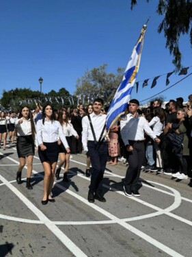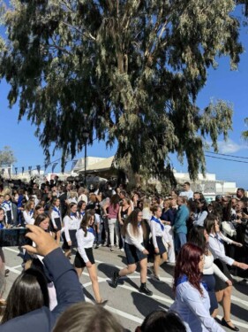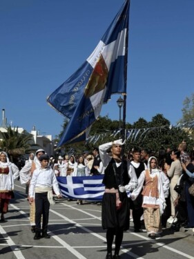 Οι εκδηλώσεις κορυφώθηκαν με την παρέλαση μαθητών όλων των βαθμίδων, πολιτιστικών συλλόγων καθώς και τμήματος της Εθνοφυλακής Θήρας, υπό τους ήχους της Φιλαρμονικής Ορχήστρας του Δήμου Θήρας.