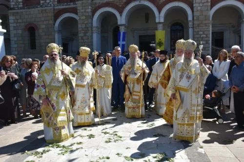 Ακολούθως τελέστηκε πολυαρχιερατική Θεία Λειτουργία, προεξάρχοντος του Σεβασμιωτάτου Μητροπολίτου Φιλιππουπόλεως κ. Νικολάου και συλλειτουργούντων των Σεβασμιωτάτων Μητροπολιτών  Καρπενησίου κ. Γεωργίου, Λήμνου και Αγίου Ευστρατίου κ. Ιεροθέου, του Θεοφιλεστάτου Επισκόπου Λευκουπόλεως κ. Πολυκάρπου, καθώς και του οικείου Ποιμενάρχου, Σεβασμιωτάτου Μητροπολίτου κ. Τιμοθέου, πλαισιωμένων από ιερείς και διακόνους.