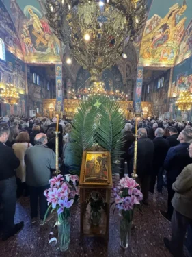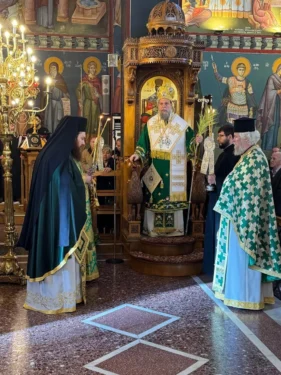 Ο Σεβασμιώτατος Μητροπολίτης Νέας Ιωνίας, Φιλαδελφείας, Ηρακλείου και Χαλκηδόνος κ. Γαβριήλ, χοροστάτησε στην ακολουθία του Όρθρου, ευλόγησε τα βάια και στη συνέχεια τέλεσε την Πανηγυρική Θεία Λειτουργία, πλαισιωμένος από κληρικούς της Ιεράς Μητροπόλεως.