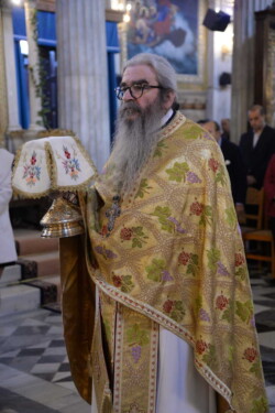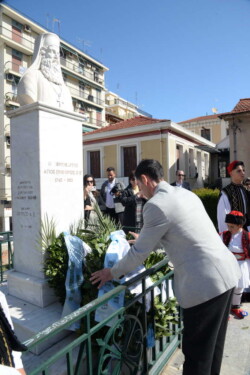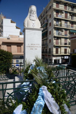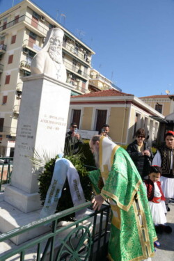 Ὁ Σεβασμιώτατος Μητροπολίτης Πατρῶν κ.κ. Χρυσόστομος ἀνεφέρθη μέ λόγους συγκινητικούς, στήν θυσία τοῦ ἱεροῦ, ὑπέρ πίστεως καί πατρίδος σφαγίου, τοῦ Ἁγίου Γρηγορίου τοῦ Ε’, τοῦ ὁποίου ἡ θυσία, πυροδότησε ἒτι περαιτέρω, τόν ἀγῶνα τῶν Ἑλλήνων γιά τήν ἐλευθερία. Ἐπίσης μίλησε γιά τό μαρτύριο τοῦ Ἁγίου ἐνδόξου Νεομάρτυρος Δημητρίου τοῦ ἐν Τριπόλει μαρτυρήσαντος τό 1803 καί τοῦ ὁποίου τά χαριτόβρυτα Λείψανα, εὑρίσκονται στήν Ἱερά Μονή τοῦ Ἁγίου Νικολάου τῶν Βαρσῶν, ὃπου ἦτο Μοναχός καί Ἡγούμενος ὁ Σεβασμιώτατος καί τέλος μίλησε μέ θερμά λόγια γιά τόν ἀγῶνα τῶν Κυπρίων γιά τήν ἐλευθερία τους, τονίσας ὃτι ἀποτελεῖ ἐντροπή γιά τήν ἀνθρωπότητα σήμερα, ἡ ἀδικία πρός τήν Κύπρο, τό νά ἒχωμε δηλ. τό 37% τοῦ Κυπριακοῦ ἐδάφους κατεχόμενο, ἀπό τούς Τούρκους εἰσβολεῖς, ἀπό τό 1974 μέχρι σήμερα. Ἡ ἐπίλυσις τοῦ Κυπριακοῦ προβλήματος καί ἡ ἂρσις τῆς μεγίστης αὐτῆς ἀδικίας, ἀποτελεῖ χρέος ὂχι μόνο τῶν μεγάλων τῆς γῆς, ἀλλά ὁλοκλήρου τοῦ κόσμου.