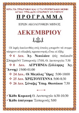 Ι.Μ. Αγ. Τριάδος Σπαρμού Ολύμπου : Πρόγραμμα Ακολουθιών Δεκεμβρίου