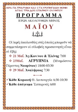 Ι.Μ. Αγ. Τριάδος Σπαρμού Ολύμπου : Πρόγραμμα Ακολουθιών Μαΐου 2025