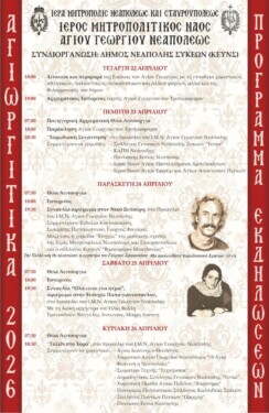 Οι εκδηλώσεις, οι οποίες διοργανώνονται από την Κοινωφελή Επιχείρηση Υπηρεσιών Νεάπολης-Συκεών, σε συνεργασία με τον Ι.Ν. Αγ. Γεωργίου, θα πραγματοποιηθούν από την Τετάρτη 22 Απριλίου ως και την Κυριακή 26 Απριλίου2026. Για πέντε ημέρες, και με οδηγό το θρησκευτικό στοιχείο που είναι και το κυρίαρχο αυτές τις μέρες, το κέντρο της Νεάπολης θα μετατραπεί σε έναν υπαίθριο τόπο μουσικών αφιερωμάτων-συναυλιών και παρουσίασης παραδοσιακών χορών.
