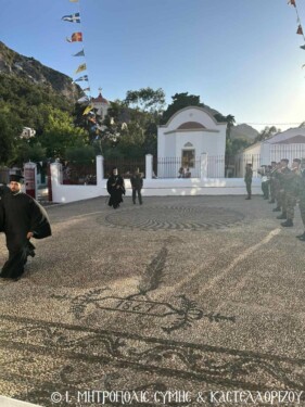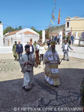 Ὁ Σεβ. Ποιμενάρχης , προκειμένου νά προστῇ τῶν λατρευτικῶν Συνάξεων τῆς Πανηγύρεως, μετέβη ἀπό τήν Τρίτη 20ή Μαΐου στό ἀκριτικό νησί συνοδευόμενος ἀπό τούς Ἱεροψάλτες κ. Παναγιώτη Μανουσάκη καί κ. Κομνηνό Κουτλινό ἐκ Ρόδου, ὡς καί ἀπό τόν ἐκ Σύμης κ. Ἐλευθέριο Ξηράκη, οἱ ὁποῖοι διηκόνησαν μελιρρύτως τά ἱ. Ἀναλόγια λαμπρύνοντες ἔτι περισσότερο τήν Ἱερά Πανήγυρη.