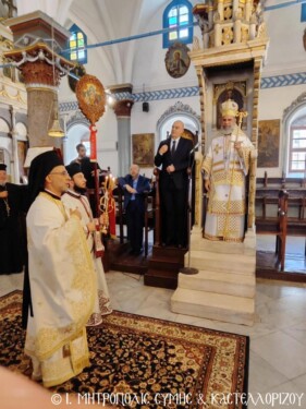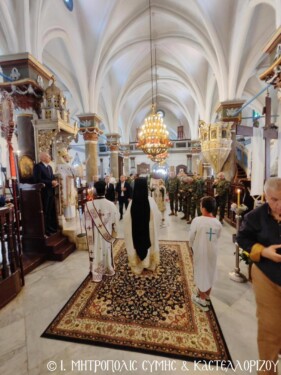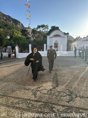 Τίς λατρευτικές ἐκδηλώσεις τῆς Ἱερᾶς Πανηγύρεως, ὡς ἀνεφέρθη, τίμησε μέ τήν ὑψηλή παρουσία του ὁ Ὑπουργός Ἐθνικῆς Ἀμύνης κ. Νικόλαος Δένδιας, τόν ὁποῖον ὁ Σεβ. κ. Χρυσόστομος, ἐκ μέρους τῆς Α.Θ.Π. τοῦ Οἰκουμενικοῦ μας Πατριάρχου κ.κ. Βαρθολομαίου καλωσόρισε διά καταλλήλου προσλαλιᾶς καί πάλιν στήν Ἱερά Μητρόπολη Σύμης, μίαν εἰσέτι ἐν Δωδεκανήσῳ Ἐπαρχία τοῦ Οἰκουμενικοῦ Θρόνου καί δή στό ἀκριτικό μας Καστελλόριζο. Ἐπιπλέον συμμετεῖχαν οἱ ἑξῆς ἐπικεφαλῆς τῶν Ἀνωτάτων Στρατιωτικῶν Ἀρχῶν τῆς Πατρίδος μας, ὁ Ἀρχηγός Γ.Ε.ΕΘ.Α. Στρατηγός κ. Δημήτριος Χούπης, ὁ Διοικητής τῆς Ἀνώτατης Στρατιωτικῆς Διοίκησης Ἐσωτερικοῦ καί Νήσων (Α.Σ.Δ.Ε.Ν.) «ΑΙΓΕΑΣ», Ἀντιστράτηγος κ. Ἐμμανουήλ Θεοδώρου καί ὁ Διοικητής τῆς 95 ΑΔΤΕ Ὑποστράτηγος κ. Σπυρίδων Κογιάννης.